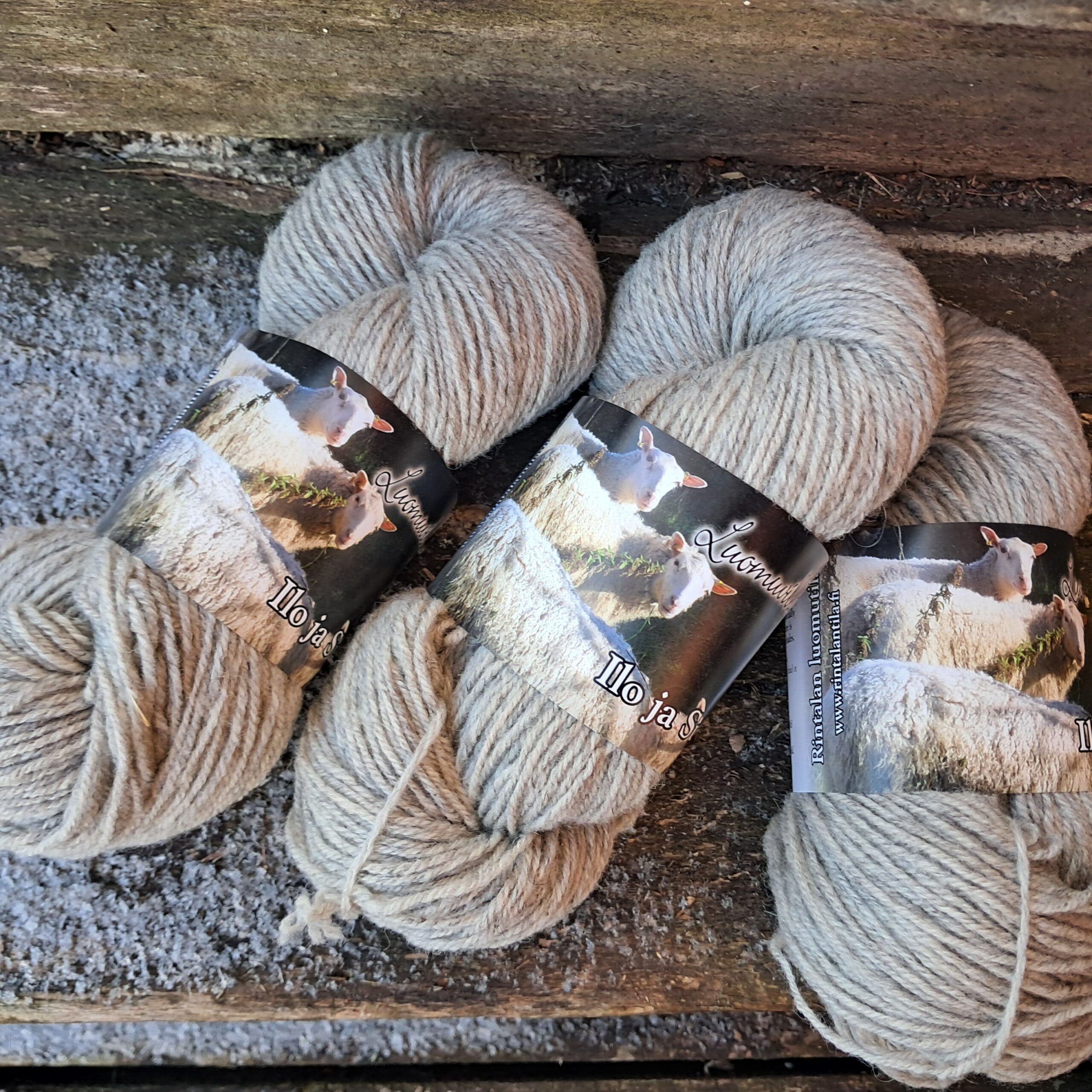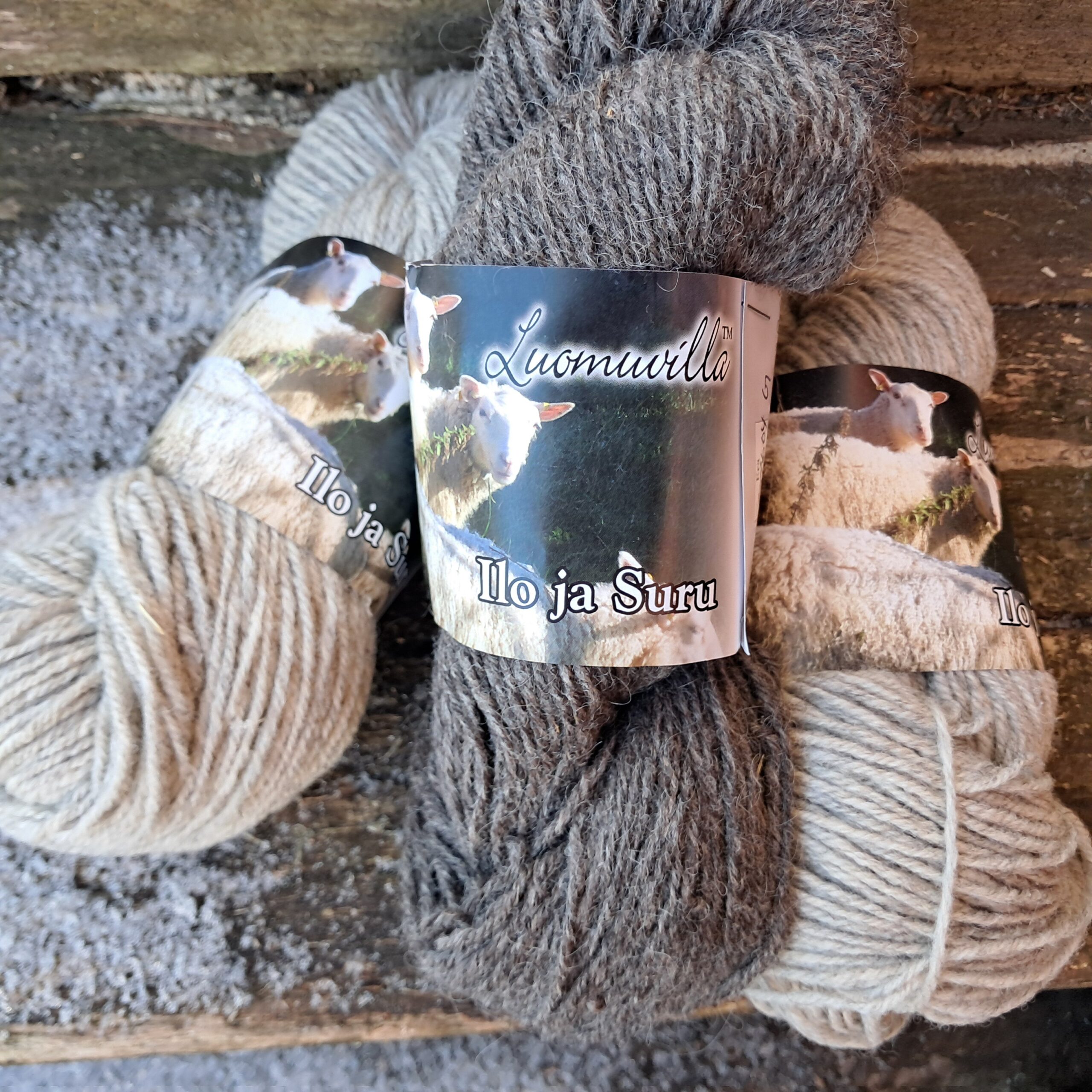 - 3-säikeinen tiiviskierteinen yleislanka, jossa suomenlampaan villaa 85 % ja biohajoavaa polyamidia 15 %. Ilo ja Suru sopii hyvin villasukkien neulomiseen, mutta käy myös kaikkeen muuhun, kuten kestäviin ja lämpimiin ulkoiluvillapaitoihin. Villan lämpimyys ja kosteudenimemiskyky ovat yhä tallella. Pese ja huuhtele neule käsin n. 40 ºC tai koneessa villapesuohjelmalla. Villaa ei kannata pestä turhaan, usein pelkkä tuuletus riittää.